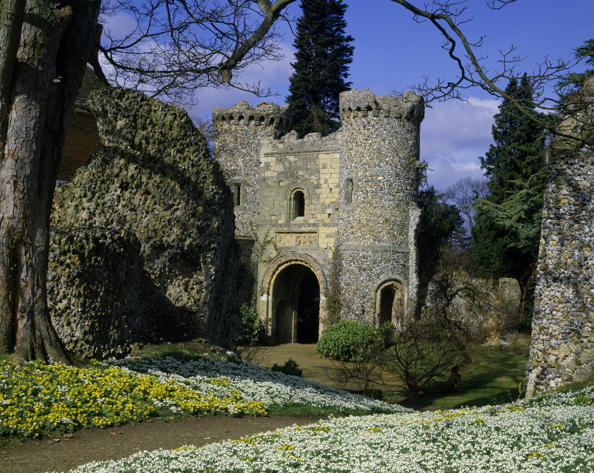 The garden is famous for its display of naturalised snowdrops around the moat and inner bailey. In spring, following the snowdrops, the garden is covered in swathes of scilla byzantica, daffodils, fritillaries and flowering shrubs and trees.