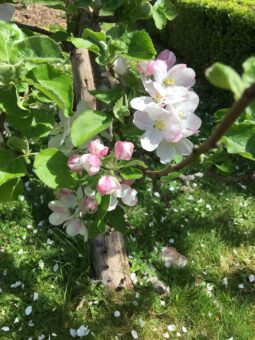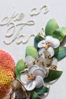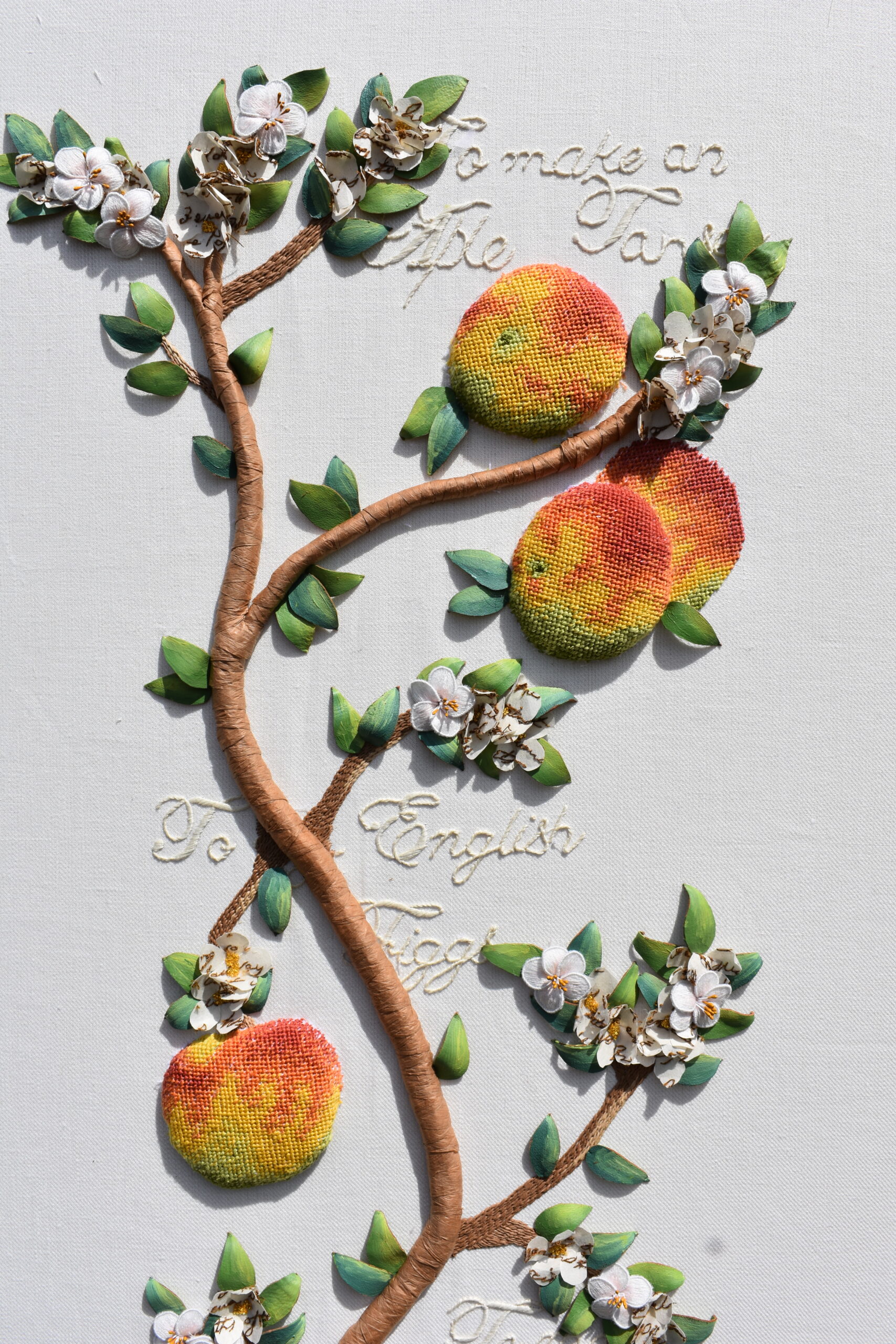 Her project culminated in three exquisitely embroidered panels, each a testament to the combination of beauty in nature, skilled artistry and intellectual endeavour that characterise the Gardens, the artworks and the women writers at Chawton House. One panel takes influence from the Orchard at Chawton House, depicting the seasonal change from blossom to apples, alongside embroidered text from the Knight cookbook, passed down through generations of the family’s women. One recreates the Rose Garden alongside early eighteenth-century botanist Elizabeth Blackwell’s Curious Herbal, written and illustrated by Blackwell to educate on the medicinal uses of plants. The final panel illustrates the Library Terrace draped in wisteria, with the names of women writers beneath, some well-known and others now almost forgotten.